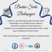 Bartın Üniversitesi Edebiyat Kulübü üyeleri tarafından hazırlanan "Bartın Şiirle Buluşyor" isimli proje ÜNİDES 5. dönem kapsamında destek almaya hak kazandı.Emeği geçen tüm öğrencilerimizi tebrik ediyoruz.